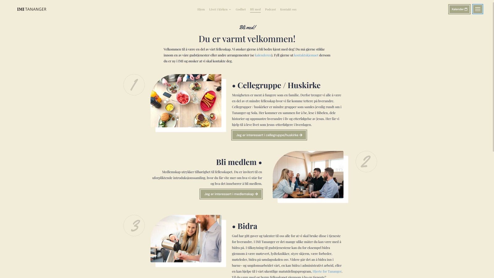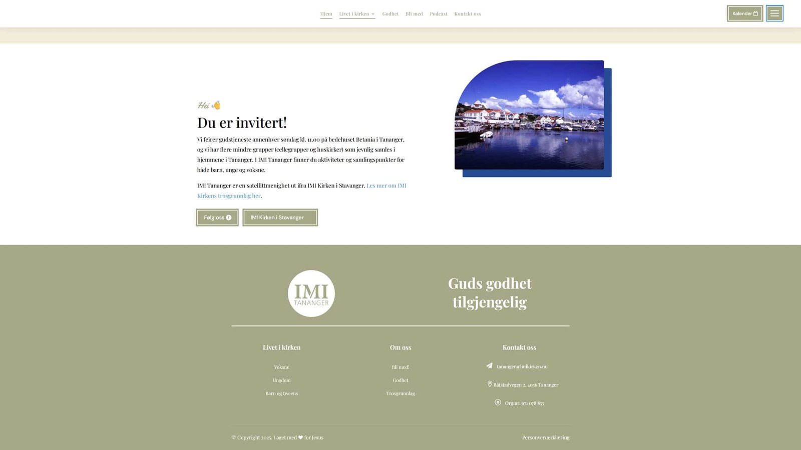IMI Tananger er en satellittmenighet ut ifra IMI Kirken i Stavanger. De ønsket en egen nettside for å presentere sine tilbud. Podcast-avspilleren gjør det lett å søke i tidligere prekener. Nettsiden er integrert med Google kalender.